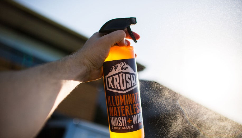 THIS SUPER HYDROPHOBIC WATER-BASED FORMULA CONTAINS SILICA NANO PARTICLES THAT WILL CREATE A HARD-COAT PROTECTIVE BARRIER THAT REPELS WATER. KRUSH ILLUMINATE WATERLESS WASH IS PERFECT FOR MAINTAINING YOUR E-BIKES, MTBS AND ROADIES BETWEEN HEAVIER WASHES.