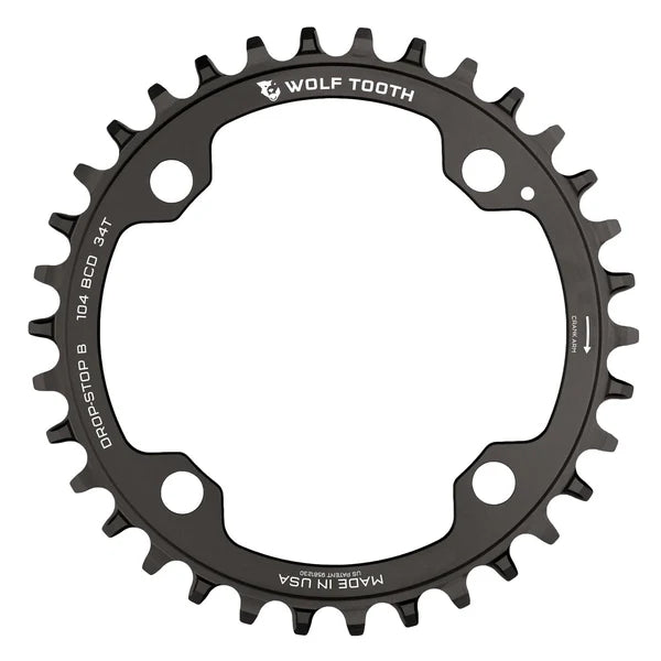 • Drop-Stop technology. On Wolf Tooth’s patented wide/narrow chainring, the wide side of the tooth has maximum contact on the drive side which spreads the load and improves chainring life. The narrow side allows clearance for mud and debris which reduces friction.
